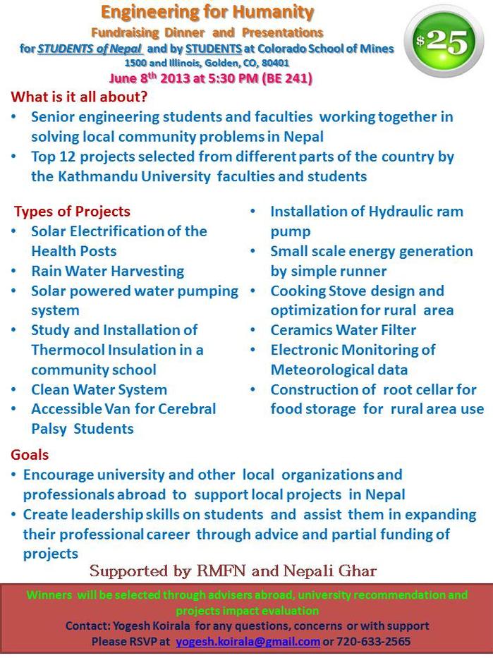 At the beginning, Nepalese Student Association at mines (NSAM) officers had the opportunity to get exposed with the rules and regulations and activities that as student organizations could do. Hence this organization came up with a vision that not many universities international student’s organizations have thought about. At the beginning with the help of local Nepalese professional of Colorado, NSA was able to have a connection with Kathmandu University. Our goal was to encourage the senior engineering students of bachelor and master level to identify local community problem and help them solve it using their engineering skills. The main objective of NSAM at the beginning is to be able to fund the project and help them to execute it in co-ordination with their advisers and professionals in Nepal and abroad. Once the mechanism is established, we will try to make it a self-sustainable where students at Nepal will find ways to fund their own projects through similar fund raising events.