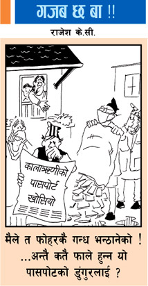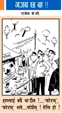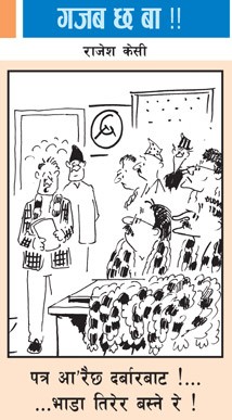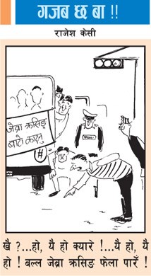 I enjoy his cartoons a lot. Please check a collection of his cartoons "Rajesh KC Ko Cartoon Shangraha : Part-1" (2004). Very nice one.