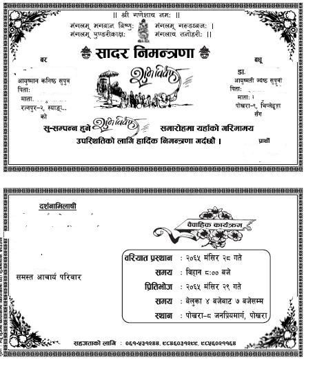 गाम्ले हो हाम्रो भौते दाको बिहेको कार्ड बाद्न म अैपुगेहै ताअाअाअा। हिजो फोनमा सपैलाई निम्तो बध्ने जिम्मा चै तिम्रो भो ठुल्ननी भन्नु भो लु सपै लाई सपरिवार शाहीत निम्तो छ है।
