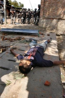 Nepalese riot policemen stands next to body of demonstrator who was killed during a demonstration in Katmandu, Nepal, Thursday, April 20, 2006. Nepalese police opened fire Thursday on tens of thousands of pro-democracy protesters who defied a curfew to march toward the capital, killing at least three and wounding dozens more, witnesses and hospital officials said. (AP Photo/Rajendra Manandhar) Email Photo Print Photo