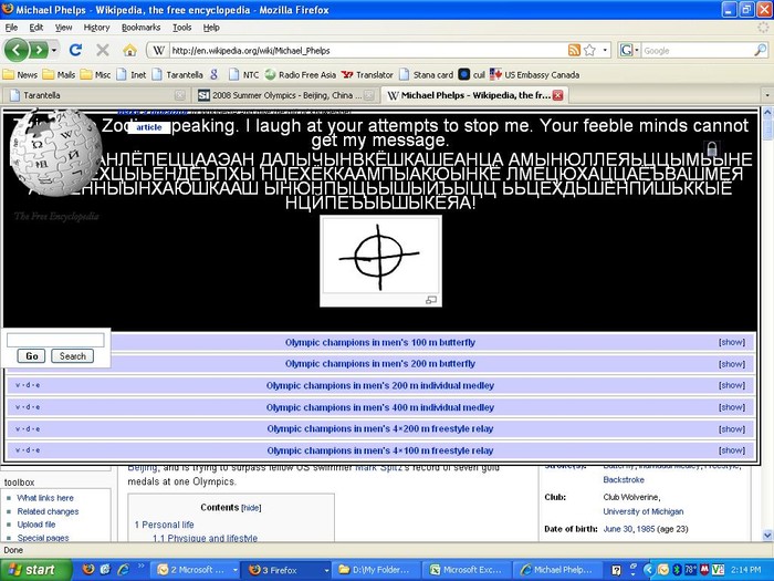 Guys, this is what I saw a moment ago while trying to search Michael Phelps on www.wikipedia.com but looks like it's been fixed now. I've print screened it and saved it. Take a look