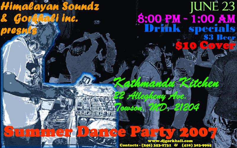 Himalayan Soundz & Gorkhali Inc. presents Summer Dance Party 2007 Venue - Next Door 2 ---> Kathmandu Kitchen Towson, (Baltimore) Maryland Date - June 23rd 2007 on a Saturday Time - 8:00 PM till 1:00 AM Live Music w/ DJ , Adult Drinks and Beverages with Food Note:- 21 to Drink and 18 to Party