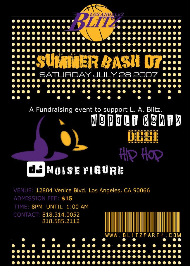 http://www.blitzparty.com Fund raiser event for LA's basketball team - Los Angeles Blitz. Please come and support us! DJ Noise Figure will be spinnin' tunes all night long. 18 to dress 21 to impress