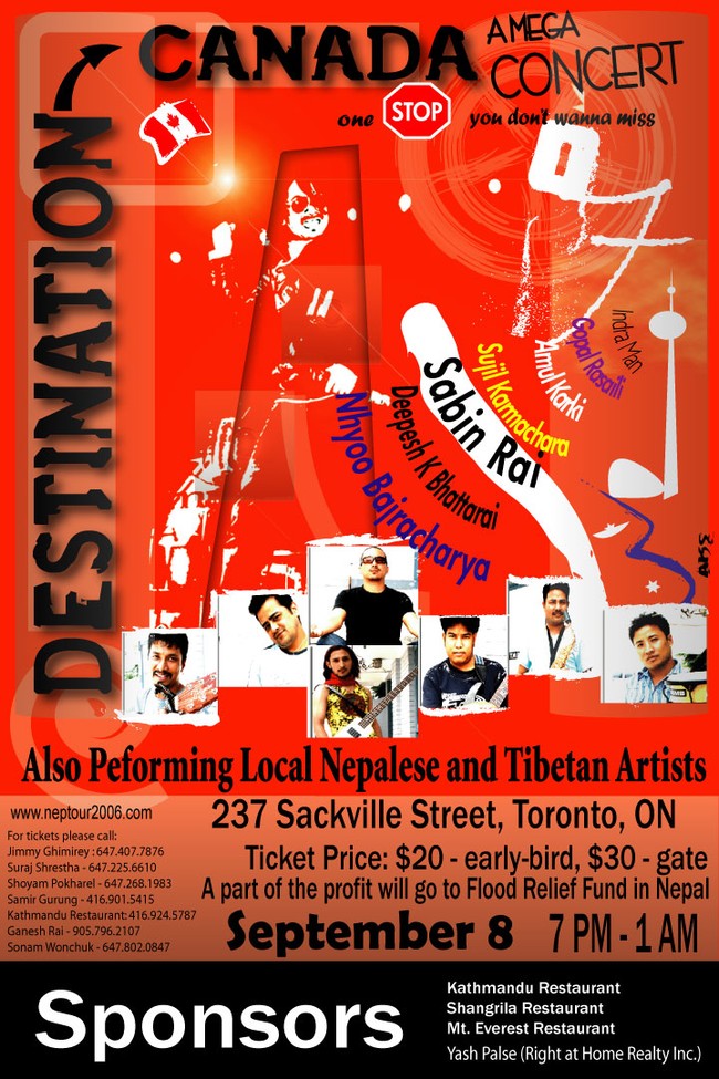 Destination Canada 2007 Mega-concert : September 8, 2007 Artists: Sabin Rai, Deepesh K. Bhattarai, Sujil Karmacharya & Nhyoo Bajracharya Musicians : Gopal Rasaili (Guitarust), Indra Man (Drums/Percussions), Amul Karki (Saxophone/Flute/Keyboard) For Details please contact - Jim Ghimery: 647.407.7876, jim.ghimery@gmail.com Direction to Venue: Intersection of Dundas and Sackville (same hall as Mukti's Concert) Dundas is in repairs, it is best to get off College Subway Station and take 506 East bound to Sackville Street Stop and walk South towards Dundas Street.