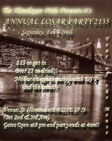 Yes, its about that time of the year that you showed your support by attending the Annual Losar Party/Pre-Valentine event organized by a group of NYC's finest Neps/Tibs aka "The Himalayan Pride": A group of Nepali and Tibetan youths whose sole intention is to party it up in NYC.