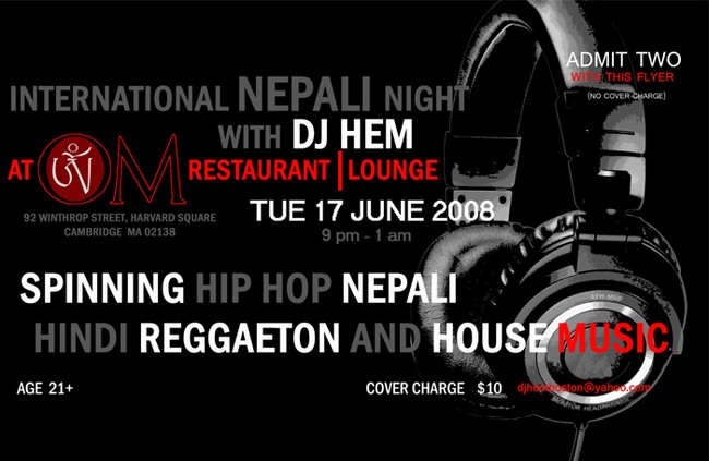 Dj HEM after kicking gigs in Delhi, now playing for you all at om restaurant & lounge at Harvard square, welcomes all Nepali people to om restaurant & lounge on tue 17th june 2008. 9pm to 1am. cover charge $ 10 and free entry with flyer. you can pick up the flyer from om restaurant and other Nepali hot spots. this party is dedicated to all the new comers to Boston. peace