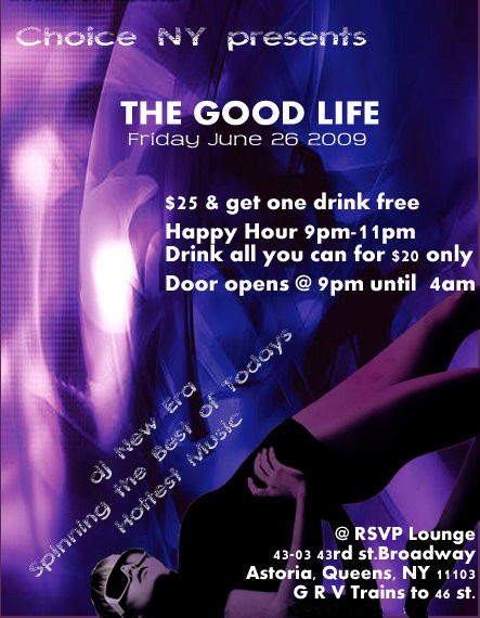 Give it up for the hottest party of the season "The Good Life" Experience the Exotic! Get a free drink with your ticket! Open Bar 9-11 for$20 only. Please come early to avoid long lines. I can't stress it enough to arrive early. DJ New Era plays the latest Hip-Hop, Rock, RnB, Reggaeton, Old school and more. All large parties and groups can RSVP a table and get free entrance with a bottle drink of your choice. Ask about our free special birthday package with free champaigne and extension on free admission. There are fantastic bottle specials that can't be matched! Contact us at choic3ny@gmail.com for Table service and bithday specials. And lastly, PLEASE DRESS YOUR BEST TO IMPRESS YOUR OPPOSITE SEX!!! You're all in for a WILDDDD night..To expedite entry for large parties, Table service is highly recommended.