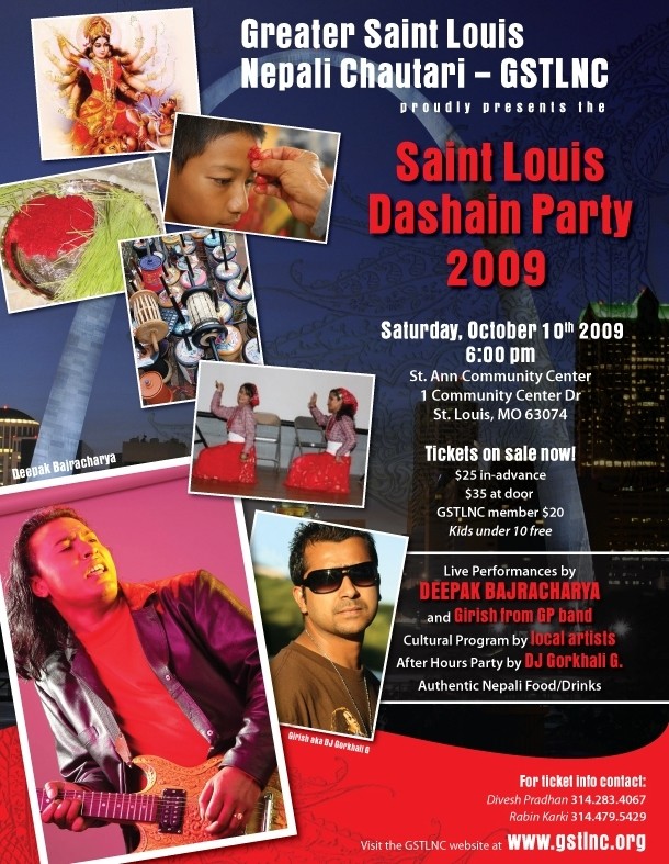 Greater St. Louis Nepali Chautari - GSTLNC will be hosting Dashain Party on Saturday, October 10th 2009 for Greater Saint Louis metro area. It will be a fun filled event with live performance by Deepak Bajracharya,