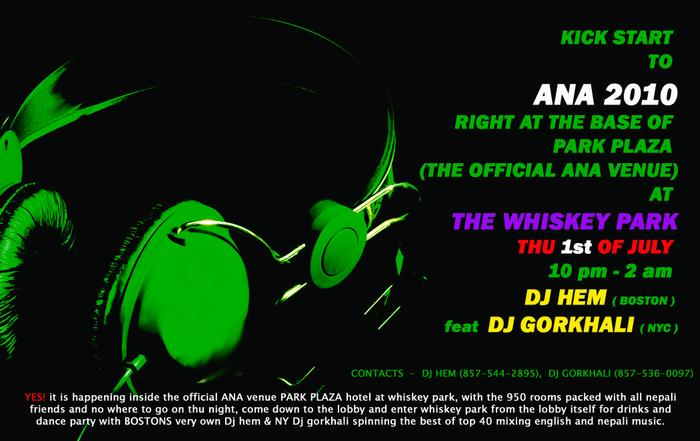 ANA kick start with dj Hem and Dj Gorkhali (NYC) at the ANA 2010 venue PARK PLAZA inside WHISKEY PARK, party starts at 10pm - 2 am.