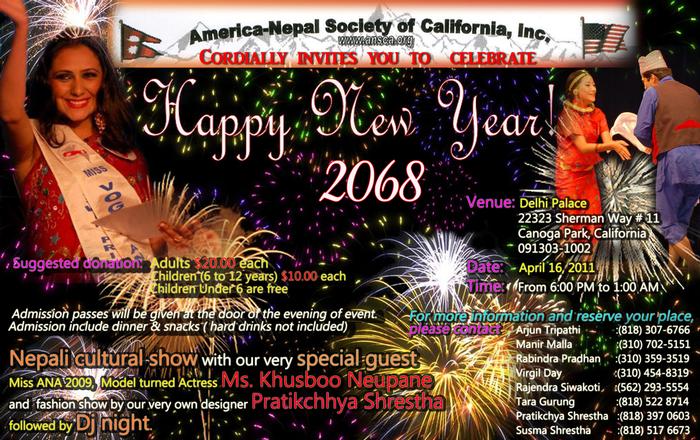 An eclectic evening that fuses culture, music and fashion. A platform for social cause. America Nepali society of California cordially welcomes you to celebrate Nepali New Year 2068. Enjoy a festive Nepali cultural show featuring Miss ANA 2009 & Nepali Actress , Khusboo Neupane. Feel a glamorous evening of exotic fashion by a talented Nepali designer. Be an agent of change in the lives of poor Nepali students who have yet to see a computer. All amid delicious south East Asian cuisine and DJ. Please check the flyer for more details. Suggested donation: Adults $20.00 each Children (6 to 12 years) $10.00 each Children Under 6 are free Attractions: Cultural show, Fashion Show, and DJ