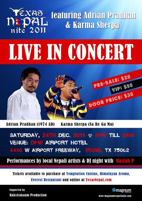 TexasNepal.com is organizing a Nepali concert featuring Adrian Pradhan and Karma Sherpa along with performances by DFW Nepali talents in Irving on Saturday 24, 2011.
