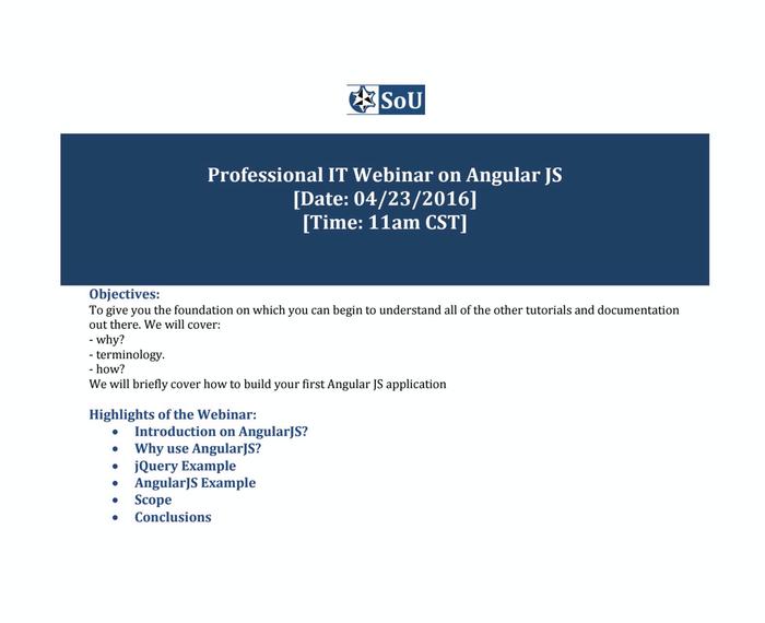 Sentience Techno-Management Solutions is proud to announce a free webinar on Angular JS. This session will be for an hour. Please join our highly experienced instructor in this webinar to learn and brush up your skills on Angular JS. Please see below for details