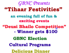 Greater Boston Nepali Community presents, ================================ Tihar Festivities with FIRST DEUSI-BHAILO Competition ================================ where Winner Deusi-Bhailo Team WINS $100 ================================ GBNC Elections Cultural Program Delicious Nepali Dinner Please register your Deusi-Bhailo teams today to participate. Your team will have 5 minutes to sing and dance your Deusi-Bhailo. A panel of distinguished Boston Nepalese will evaluate your performance and choose the winner team. Register your teams today with any of following: Prasanna Dhungel 617 861 7464 Ishwar Khatiwada 617 718 1720 Diwaskar Adhikari 978 397 0034 Bombay Market Cafe of India Bombay Club We will also be holding elections to form the new GBNC Executive Commitee. There will also be a cultural program followed by a delicious Nepali dinner. If you would like to perform songs and dances, please do let us know as well. When is the program? --------------------- Bhai-Tika Evening Sunday November 14th 2004 Where? ------ VFW Memorial Hall, 688 Huron Ave, Cambridge, MA What time? ---------- 4 pm - Hall opens 5 pm - Cultural Program 5:45 pm - GBNC Election and new committee formation 6 pm - Deusi - Bhailo Competition 7:30 pm - Dinner 9 pm - Close Price? ------ $15 per person $10 for students with a valid student ID $40 for a family of 4 adults Children under 10 years old are allowed free entry Thank you. Your GBNC Executive Council 2003-2004.