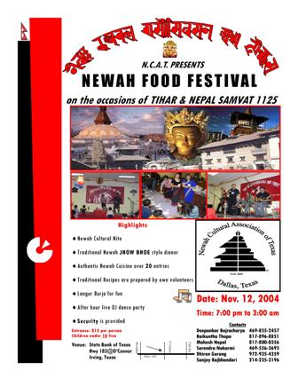 WHO : Newah Cultural Association of Texas, NCAT ( Organizer ) WHAT : Newah Bhoj and Tihar Celebration An evening of Newari dances and songs ( With Authentic Newari Cusine ) WHEN : 12th November, 2004 Starting at 7pm - 3am WHERE : State Bank of Texas Irving, Texas 75062