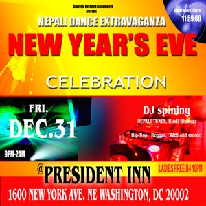 Danfe Entertainment Inc Presents NEPALI DANCE EXTRAVAGANZA NEW Year's Eve Celebration Let's come and enjoy the night full of fun, food and Drink. We will have couple of best DJ's in town to make your night a memorable one. DJ will be spinning latest in Hip hop, Reggae, RnB, Bhangra, Nepali and more? Food and Cash bar through out the night. Ladies free before 10:00pm. Doors open @ 9:00pm Let's invite the New Year 2005 together. Venue: President INN (Ramada Inn) Address: 1600 New York Ave. NE Washington DC 20002 Date: Friday, December 31, 2004. Time: 9:00pm ? 2:00 am Tickets: ladies free b4 10:00pm Adults: $10 Couple: $15 (Keep your tickets for door prizes) Contact for Tickets and Info:(202) 271-5168 (703) 675-7689 PARKING AVAILABLE Free shuttle pick up and drop off from 9:00pm -1:00am to and from Union Station (red line. Metro) Direction: 1. From Baltimore: take BW parkway (295) south towards Washington DC. Follow it for about 40 miles. Then take Route 50 west towards Washington DC. Follow that for 2 miles and you will see President Inn on your right. 2. From MD 270: follow 270 south. Then take 495 east towards Silver Spring. Follow that for about 10 miles then take exit 22 B BW parkway towards Washington DC. Then take Route 50 west towards Washington DC. Follow that for 2 miles and you will see President Inn on your right. 3. From Virginia 95/395: take 95/395 north towards DC. Take D ST Capital exit from 395. Once you come to the tunnel keep your right. Then follow the sign for New York Ave. Go straight on NY Ave for about 2 miles and you will see President INN on your left as soon as you pass DREAM CLUB. 4. From Route 66: follow 66 east towards DC. Take constitution Ave. follow that to 7 St and make a left at 7 St. go to New York Ave and make a right. Follow NY Ave. for about 2 miles and you will see President Inn on your left right past DREAM CLUB.