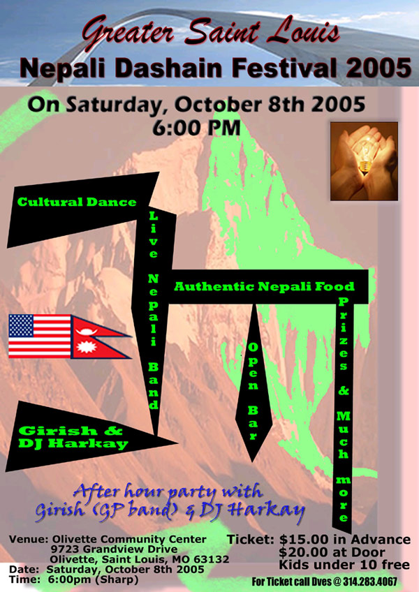 Greater St.Louis Nepalese Community for the first time presents "Nepali Dashain Festival 2005" The evening consists of cultural dances, nepali food, prizes, live nepali band, and performances by Girish(GP Band) & Dj Harkay spinnin' spicy tunes...plus "OPEN BAR"...:)