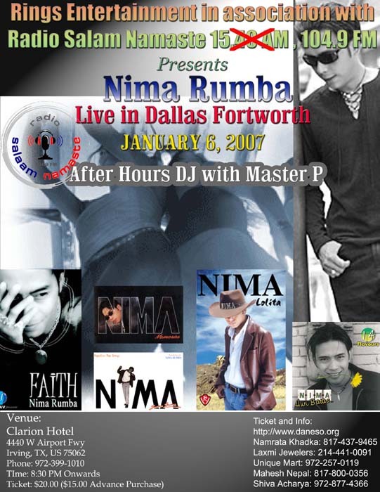 Nima Rumba live in Dallas Fortworth Date: Jan 6th Time: 8:30 pm onwards Venue: Clarian Hotel 4440 W Airport Fwy Irving, TX, US 75062 Phone: 972-399-1010 Tickets: $20 at the door, and $15 in advance Contacts: Laxmi Jewelers 214-441-0091 Unique Mart 972-257-0119 For more details including directions please visit http://www.daneso.org