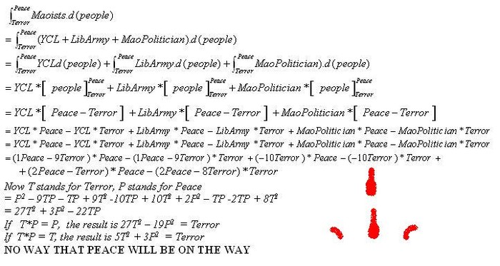 Let's suppose "maoist" is constant, now differntiating with respect to YCL, we get =Maoist *(Peace-terror) i.e. If Maiost is considered to be constant, there is no effect of YCL! And everybody want Peace so terror can be neglected. Thus, =Maoist*Peace This means, maoist can increase peace in country being positive. But right now, maiosts are in negative position, they are decreasing Peace! This solution is not entirely true coz Maoist is not constant quantity. Now, Let's consider Maoist is a variable quantity. As Maoist is a complex variable, we can break it down into two variables i.e. good maoist + bad maoist Now, we can integrate 'good maoist' from +Neutral to Peace and 'bad maoist' from Terror to -Neutral So, final solution would be, =Peace-Neutral+(-Neutral)-Terror =Peace-2Neutral-Terror This means, Maoist are combination of Peace, Neutral and Terror people. In another word, Maoist started with Terror, attract many politically neutral people (YCL) in the name of Peace in the country! And, in order to make Peace more strong, Terror should really stop (Terror=0), Neutrals (YCL) should also vanish (Neutrals=0).