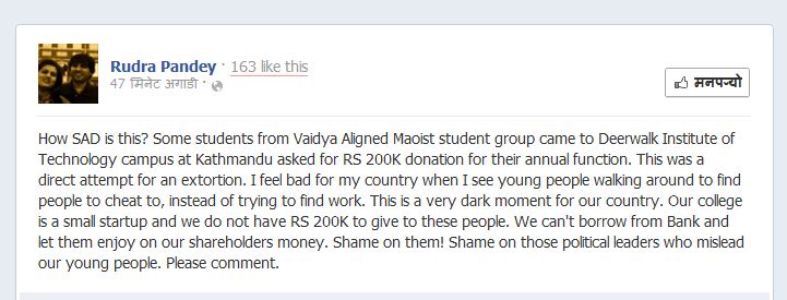 माओवादी आतंककारीवाट हट्यो, ए माओवादीको स्वागत (कोहि छन् आतंककारी ?) सुनिल दाहाल :काठमाण्डौं, २१ भदौ । अमेरिकाले नेकपा माओवादीलाई आठ वर्षपछि आतंककारी सूचिबाट हटाएको छ । यूएस डिपार्टमेन्ट अफ दी ट्रेडरीले आइतबार माओवादीलाई आतंककारी सूचिबाट हटाएको औपचारिक जानकारी गराएको छ । अमेरिका सरकार निर्णयलाई भने एकिकृत नेकपा माओवादीले स्वागत गरेको छ । तत्कालिन विद्रोही माओवादीलाई सन् २००४ देखि अमेरिकाले निरन्तर आतंककारी सूचिमा राख्दै आएको थियो । काठमाडौंस्थित अमेरिकी सेन्टरमा आक्रमण भएपछि अमेरिकाले माओवादीलाई आतंककारी सूचिमा राखेको हो । माओवादीले आतंककारी सूचिबाट हटाउन अमेरिकालाई पटक पटक आग्रह गर्दै आएको थियो । माओवादी अध्यक्ष पुष्पकमल दाहालले आंककारी सुचिवाट हटाउन अमेरिकालाई वारम्वार पत्रचार समेत गरेका थिए । यता, आतंककारी सुचिवाट हटाउने अमेरिका सरकारको निर्णयलाई एकिकृत नेकपा माओवादीले स्वागत गरेको छ । उसले पार्टीका गतिविधी युद्धताका र अहिले पनि पार्टीको गतिविधी राजनितीक नै भएकाले अमेरिकाले आतंककारी सुचिमा राख्नु दुखद भएको वताएको छ । एकिकृत नेकपा माओवादीका नेता कृष्णवहादुर महराले यो निर्णयले थप सुदृढ हुने प्रतिकृया दिए । प्रधानमन्त्री बाबुराम भट्टराईले पनि माओवादीलाई आतंककारी सूचिबाट हटाउन कुटनीतिक पहल गर्दै आएका थिए । माओवादी शान्ति प्रकृयामा आएपछि माधवकुमार नेपाल नेतृत्वमा बाहेक लगातार सत्तामा रहदै आएको छ । पार्टीका अध्यक्ष दाहाल र उपाध्यक्ष भट्टराईले गरी दुई पटक सरकारको नेतृत्व माओवादीले गरेको छ । यसअघि नै आतंककारी सूचिबाट हटाउने तयारी गरे पनि भातृृ संगठन योङ कम्युनिष्ट लिग वाईसीएलका र शिविरमा रहेका माओवादी लडाकुको गतिविधीवाट अमेरिका आशंकित हुदै आएको थियो । दुई वर्षअघि नेपाल आएका दक्षिण तथा मध्य एसिया मामिला सम्बन्धी अमेरिकी प्रमुख उपसहायक मन्त्री प्याट्रिक मुनले पनि सूचिबाट हटाउन माओवादीले हिंसा र आतंक जस्ता गतिविधी त्याग्नुपर्ने शर्त राखेका थिए । अमेरिकाले माओवादीलाई आतंककारीको सुचिमा राख्दा तत्कालिन नेकपा माओवादी युद्धमा थियो । तर शान्ति प्रकृयामा आएपछि माओवादी दुई भागमा विभाजन भैसकेको छ । अमेरिकी पत्रमा यो नै माओवादी भनेर इगित भनेर गरिएको छैन् ।। http://www.canadanepalvid.com/2012/09/news-september-7th-2012.html